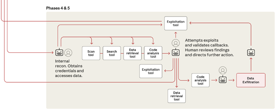 Lateral movement proceeded through AI-directed enumeration of accessible systems using stolen credentials. Claude systematically tested authentication against internal APIs, database systems, container registries, and logging infrastructure, building comprehensive maps of internal network architecture and access relationships
